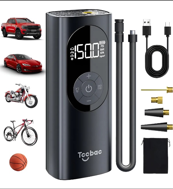 – Potente inflador eléctrico portátil, ideal para autos, bicicletas y pelotas.
